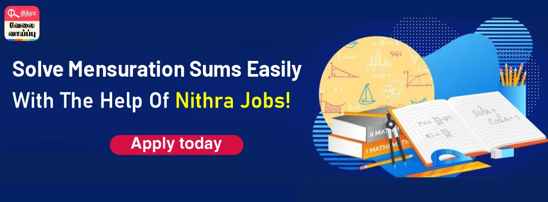 Mensuration sums are a little difficult to learn but learn it more easily on Nithra Jobs. Here the example sums for the mensuration are given step by step. Clear your queries regarding mensuration questions on our site. Apply for the jobs on the Nithra Jobs site, if you are looking for jobs in your location and various other districts in Tamil Nadu.