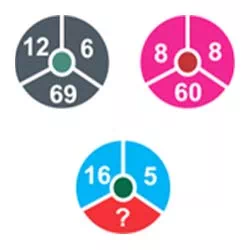 The numbers in the lower circles equal the numbers in corresponding segments in the upper circles multiplied by two, then subtract 3 for the left-hand circle, 4 for the middle and 5 for the right-hand circle.
