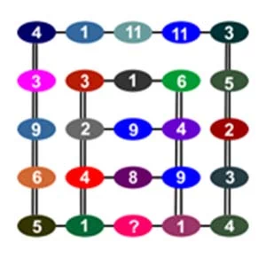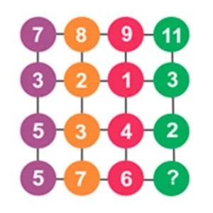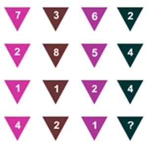 Working through the diagram in rows, add the left and central numbers together and subtract 2 to give the right-hand value.