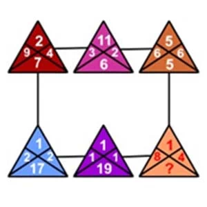 In each triangle of the diagram, the sum of the numbers is always 22.