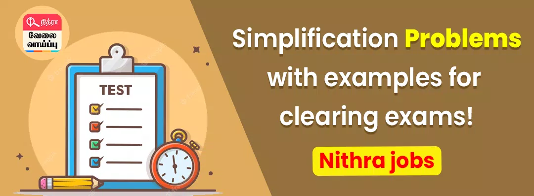Simplification problems are a common feature in exams and interviews, particularly in fields such as mathematics, logical reasoning, and problem-solving. Clearing interviews often requires candidates to showcase their problem-solving abilities. By incorporating simplification problems into interviews, employers aim to assess candidates' critical thinking skills, adaptability, and capacity to handle complex tasks efficiently by giving simplification questions for interview. Nithra Jobs site has given a few simplification questions and answers with examples and some problems for practice. These problems test a candidate's proficiency in various mathematical operations, such as arithmetic, algebra, fractions, percentages, and more. To know about the extra interview simplification problems with solutions click here.